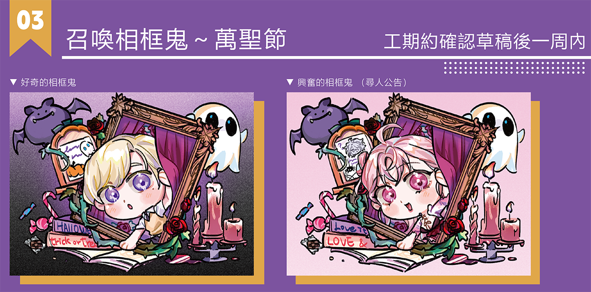 • 如需加購換裝可以給一個萬聖裝tag(如吸血鬼等),無另繪完整服裝設定圖。