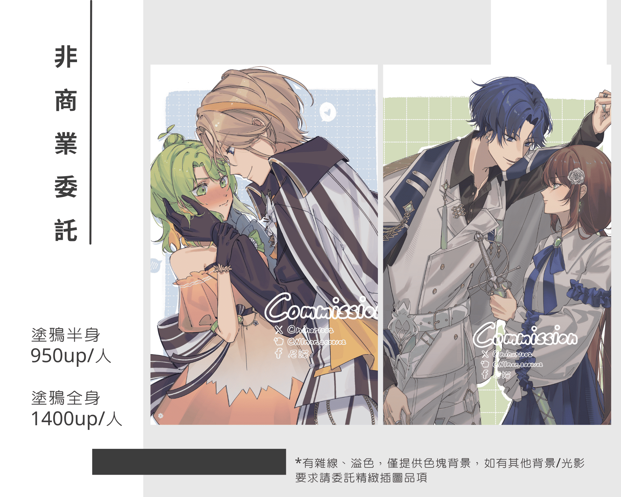 • 皆有可能公開草圖/過程,完稿一律公開,不公開價格需*2(可延後公開,兩個月內不加價)