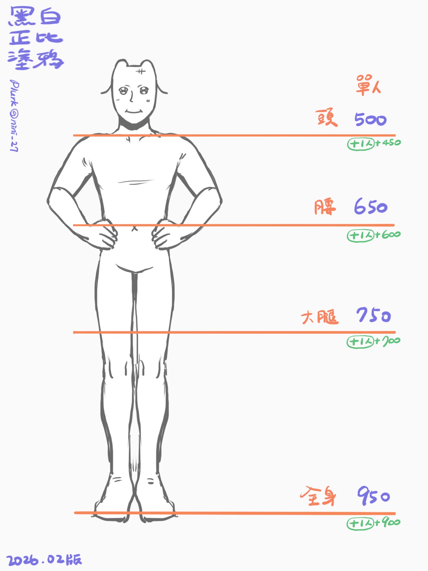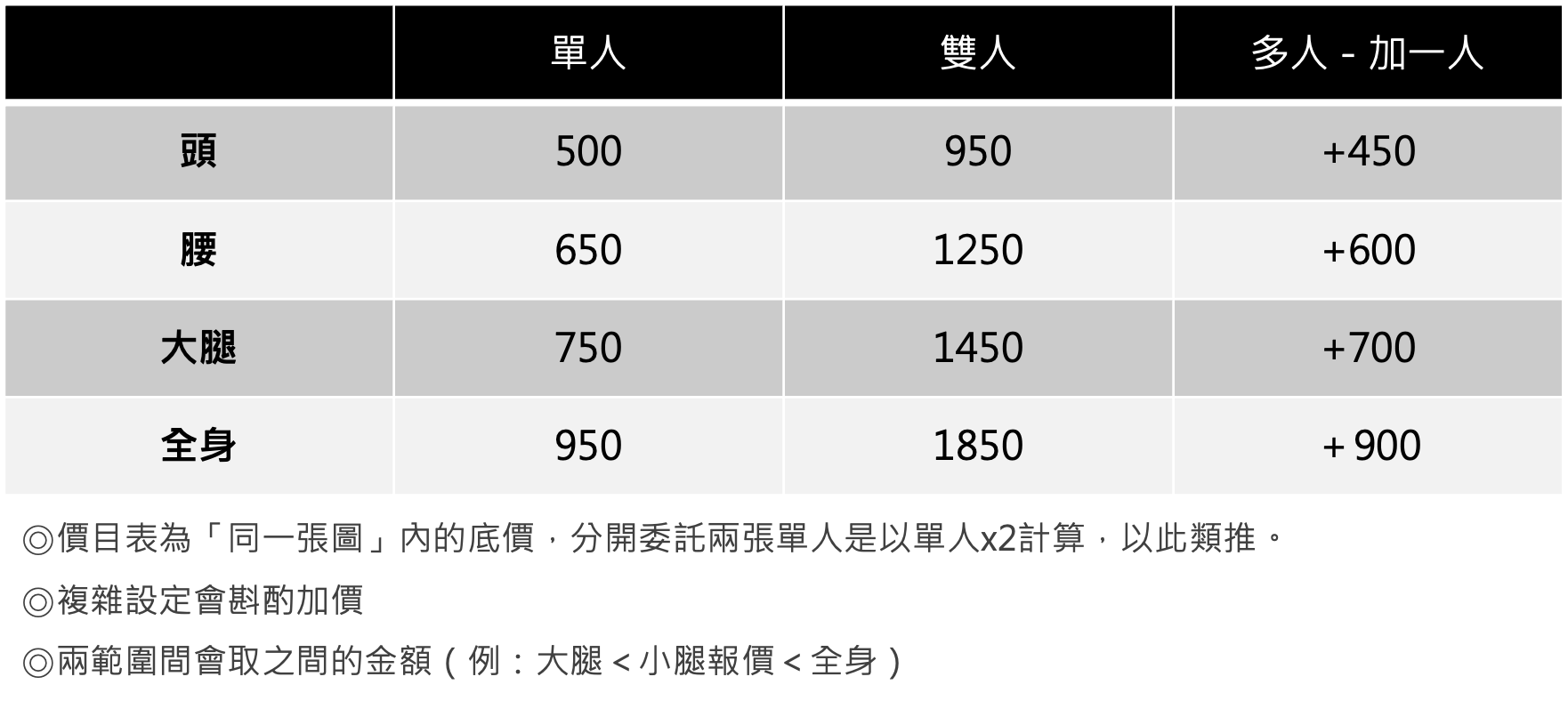 單人 / 多人+一人 頭: 500 / +450 腰: 650 / +600 大腿: 750 / +700 全身: 950 / +900 ◎價目表為「同一張圖」內的底價,分開委託兩張單人是以單人x2計算,以此類推。 ◎兩範圍間會取之間的金額,例:大腿<小腿報價<全身。 ◎複雜設定會斟酌加價,服裝上的複雜設計大約會加價100~200不等(視複雜度可能超過200) ◎報價後如超預算可以再討論預算大約多少或禮貌取消委託(真ㄉ不用不好意思!)
