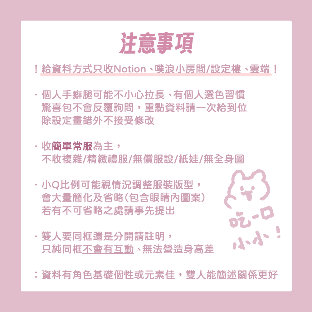 ◾️資料請整理過並盡量一次給齊全,且務必同時說清楚角色特徵、個性、雷點