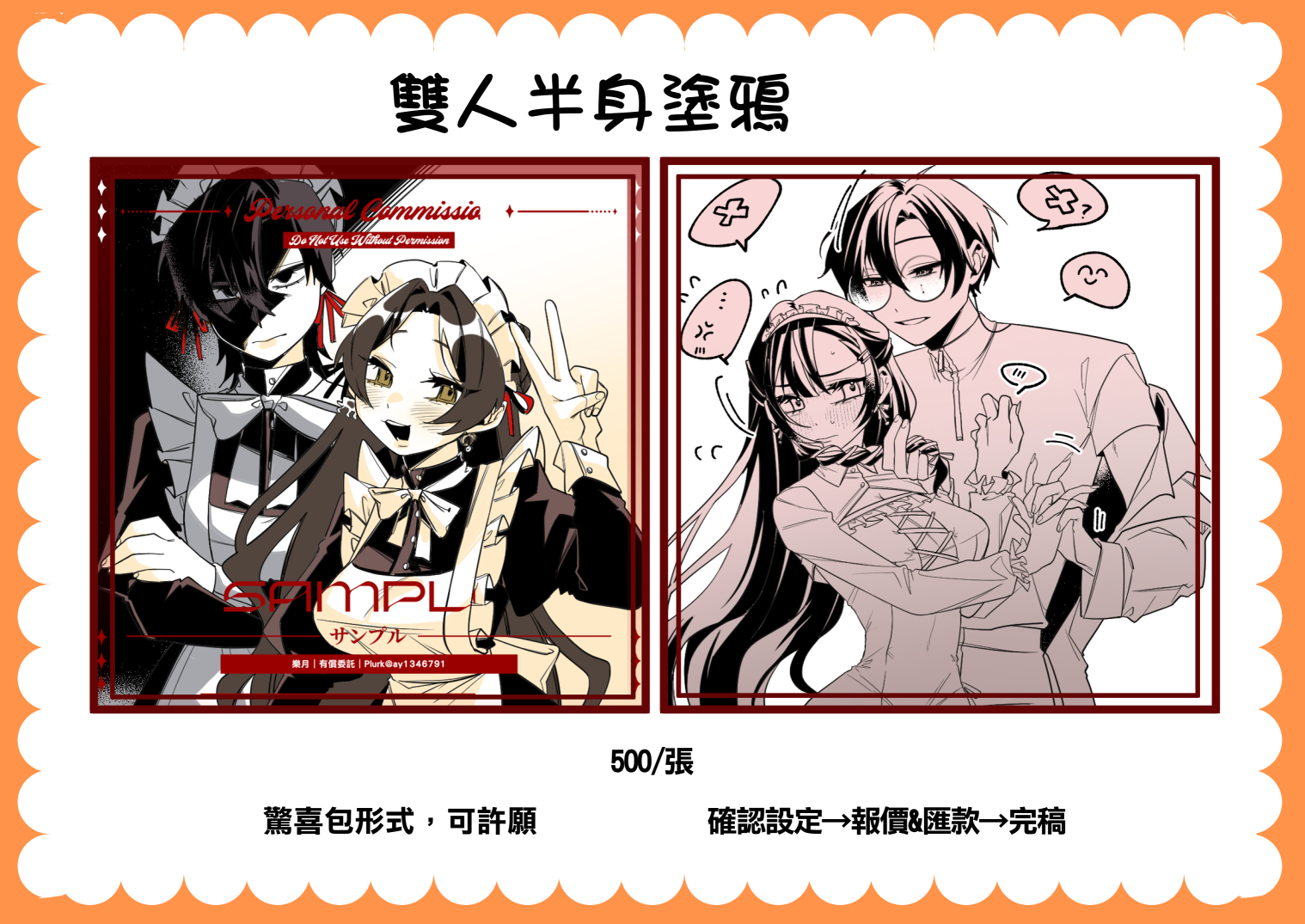 私訊詢問-討論報價-草稿確認-付半額訂金-完稿確認-付餘款-寄件