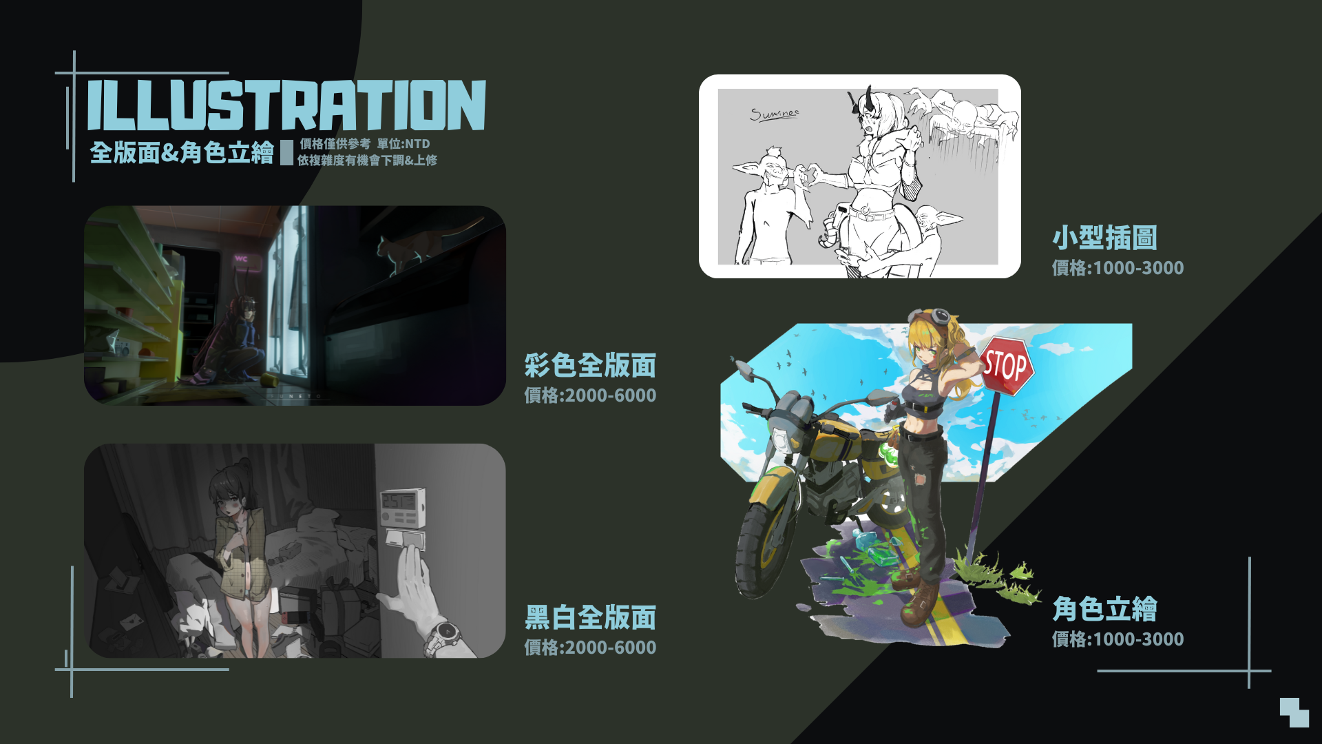 討論 → 估價 → 訂金 → 構圖草稿(討論&修改) → 第二次付款 → 完稿 → 尾款 → 交稿