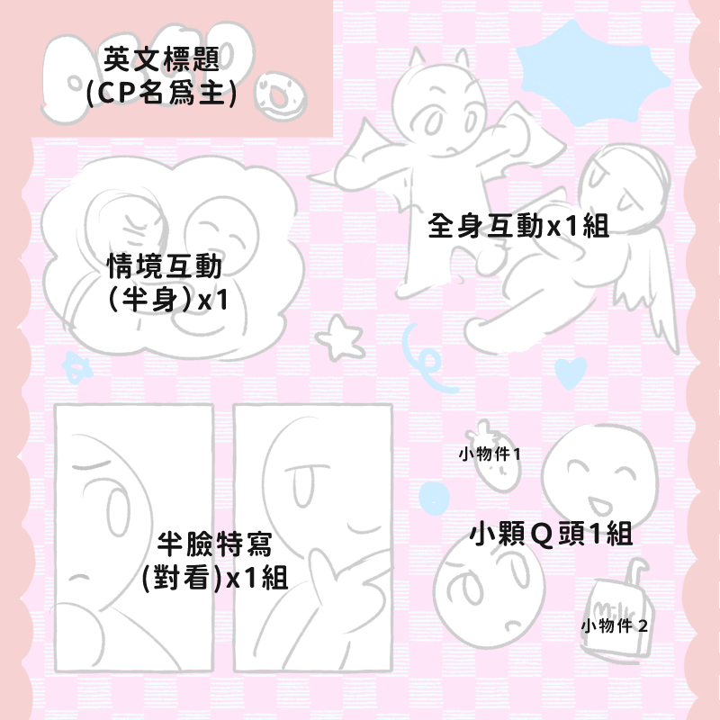 情境互動(半身)x1、全身互動x1組、半臉特寫(對看)x1組、小顆Q頭x1組、小物件x2、英文標題(CP名稱為主)