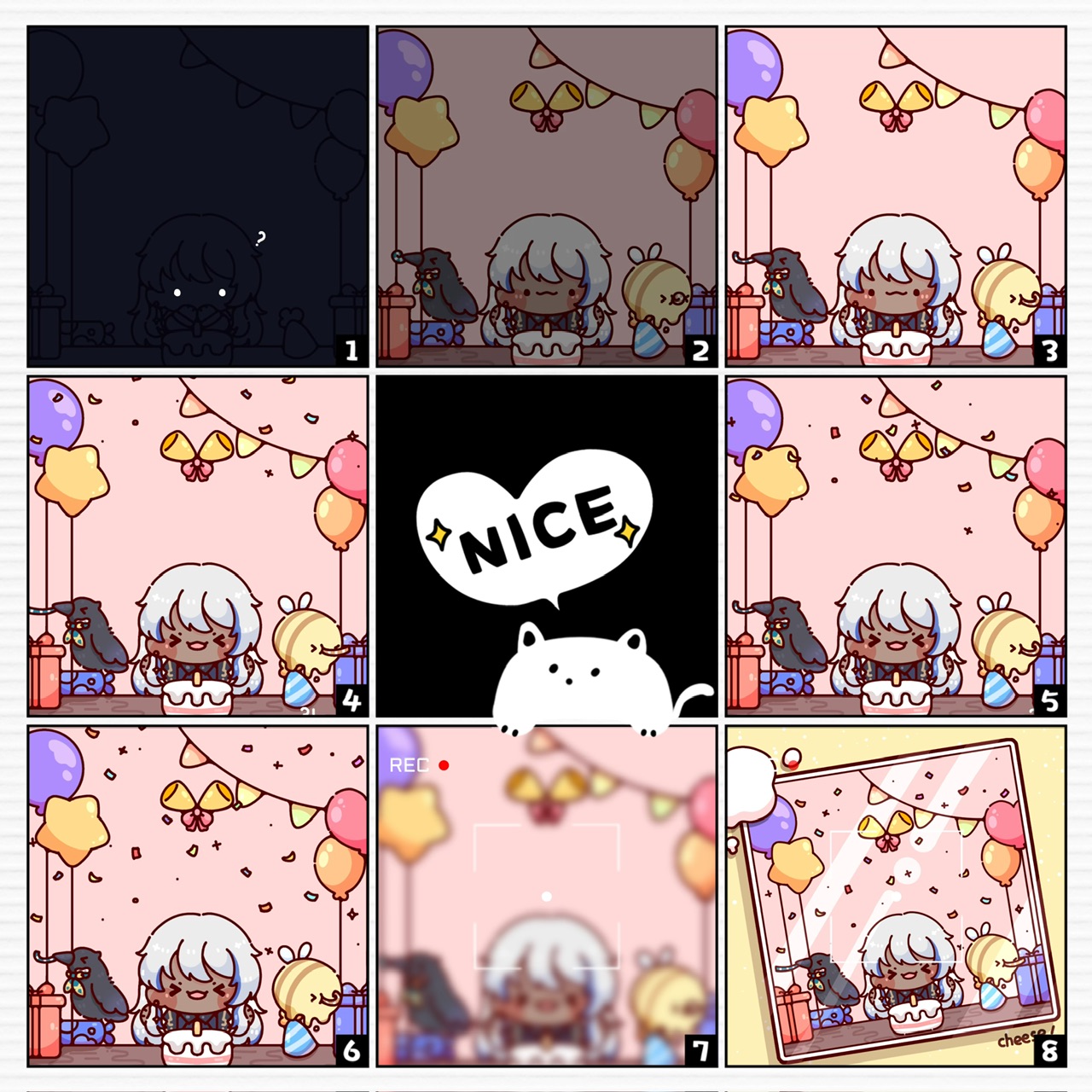 (房間變亮)主角跟(左右默認小熊)開心(動態吹生日口哨 撒禮花)