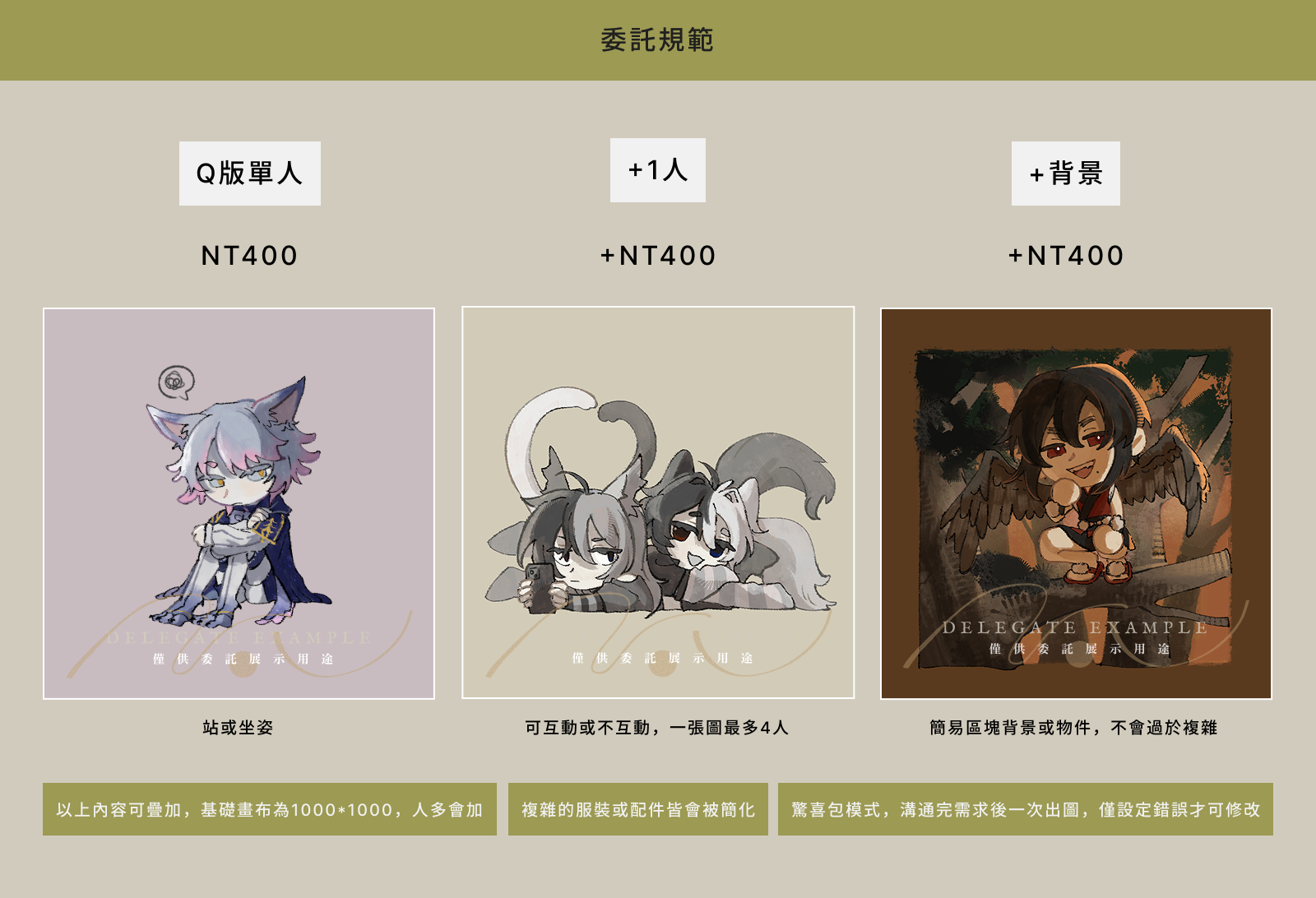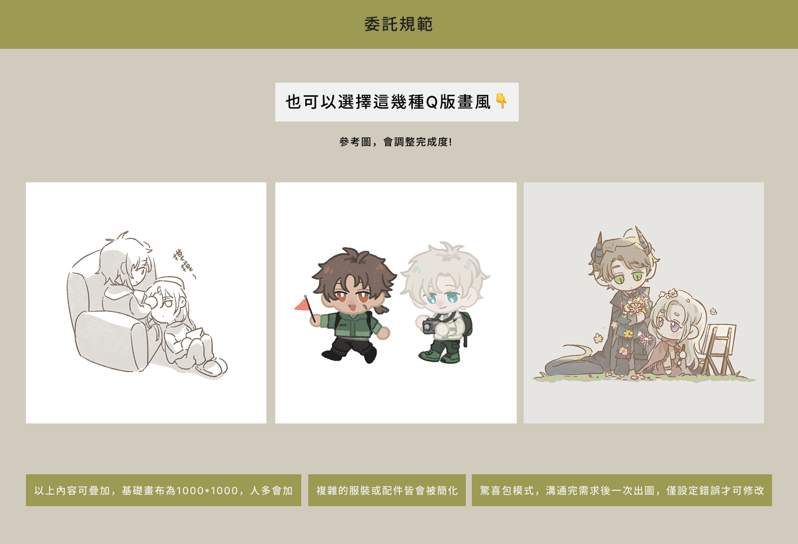 基本上使用首圖範例的畫法,如果需要選擇畫風請於溝通時告知~