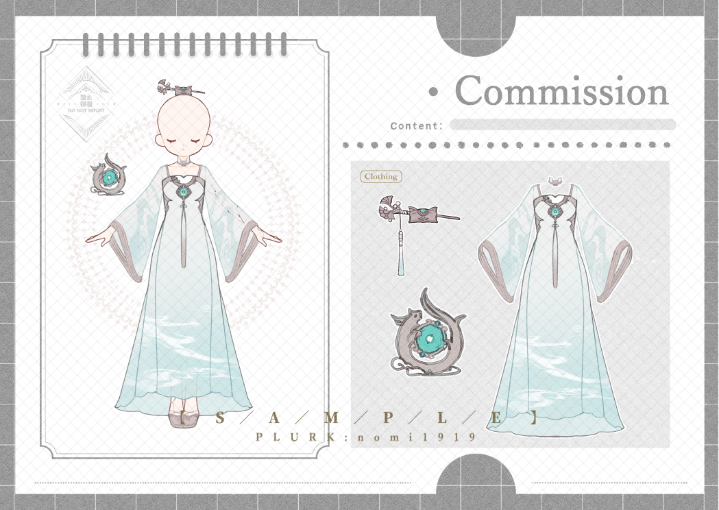 (O)可:個人收藏、同人非營利作品使用、另外約稿、補齊細節設定、增加配飾、自行設計背、簡化、自由決定服裝配飾是否穿戴。