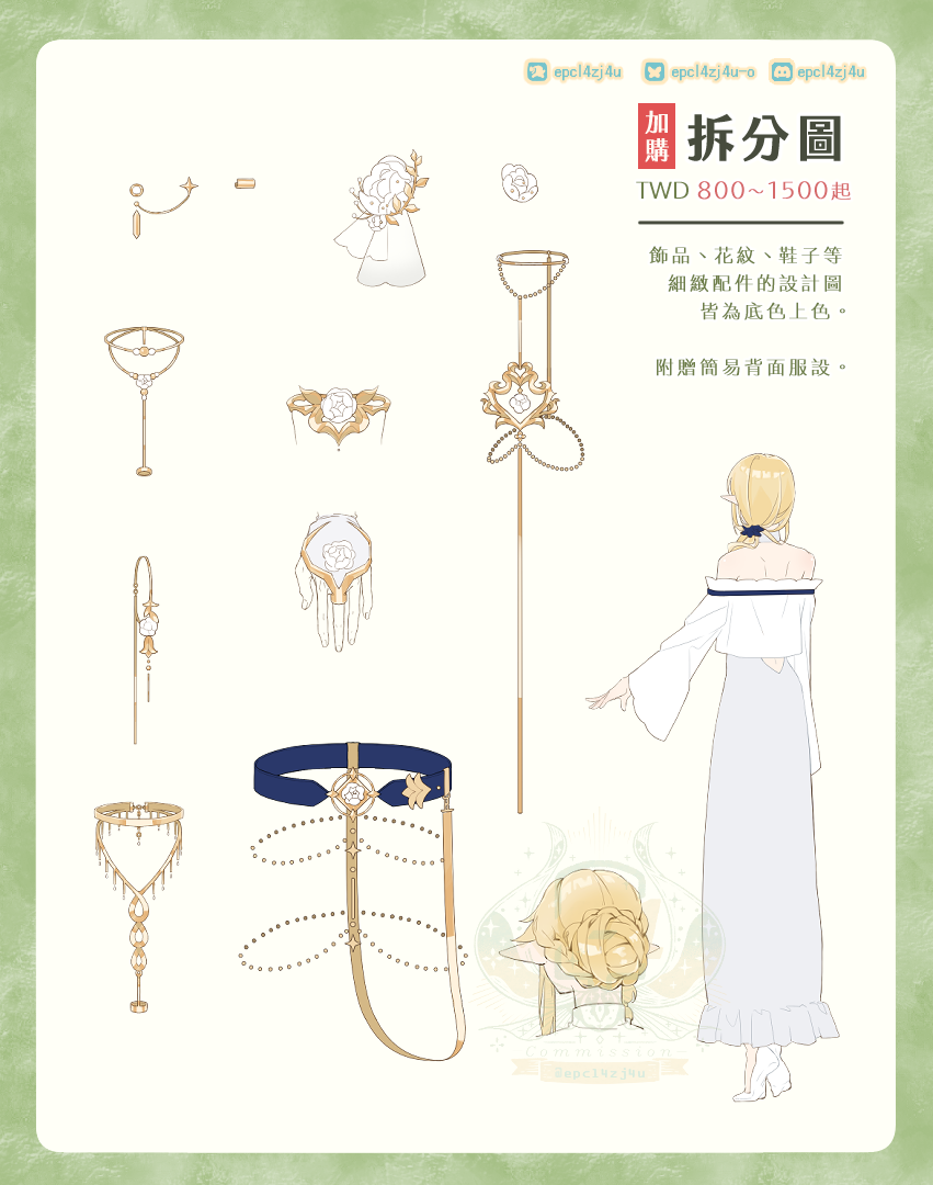 ②服裝設計可以詳細填寫每一個配件的細節,也可以給我指定元素,讓我來自由設計。