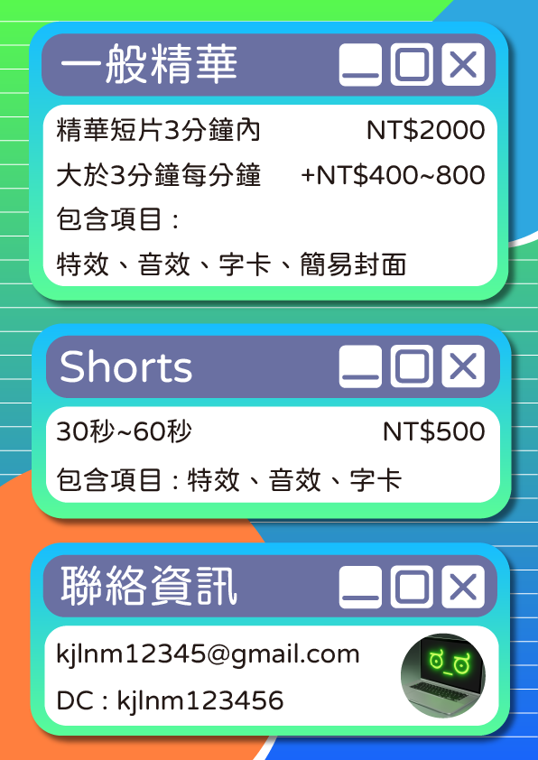 • 一般精華短片3分鐘內(有時間軸) NT$2000