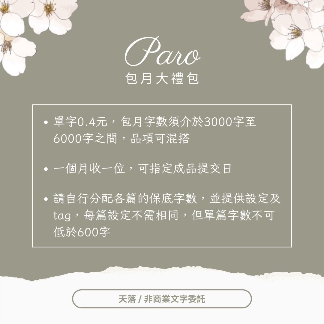 • 包月品項為網站中自備paro/隨意paro/代paro三項,可任意混搭,有其他需求也歡迎討論