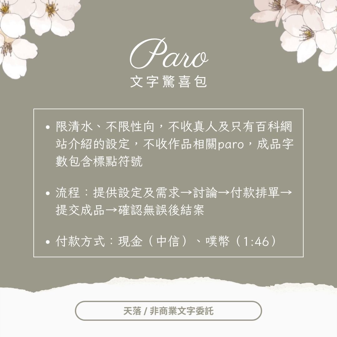 • 委託人提供之tag皆為選用,成品為telegraph及噗浪貼(亦可提供其他檔案),保底字數包含標點符號