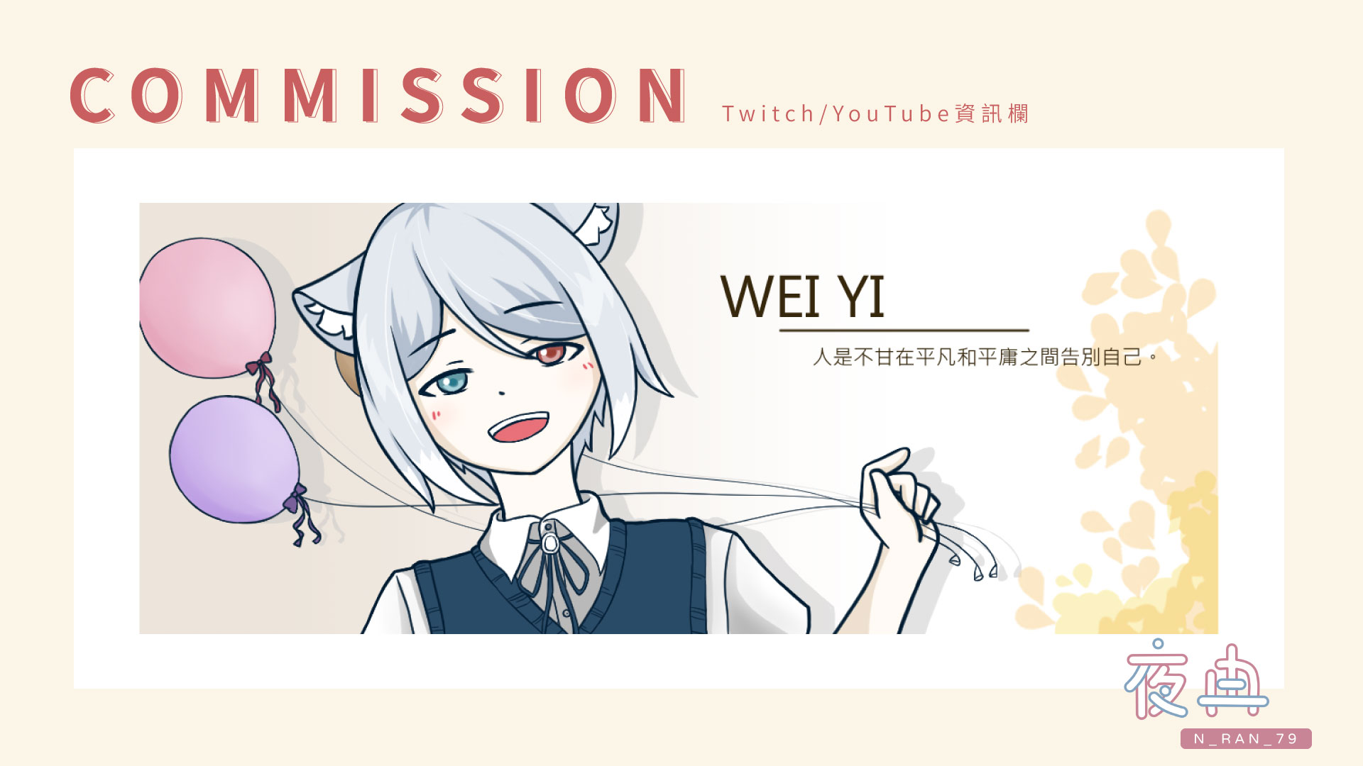 1.委託時請提供人設圖(請勿盜用他人人設),有特別要注意的特徵請提前告知。