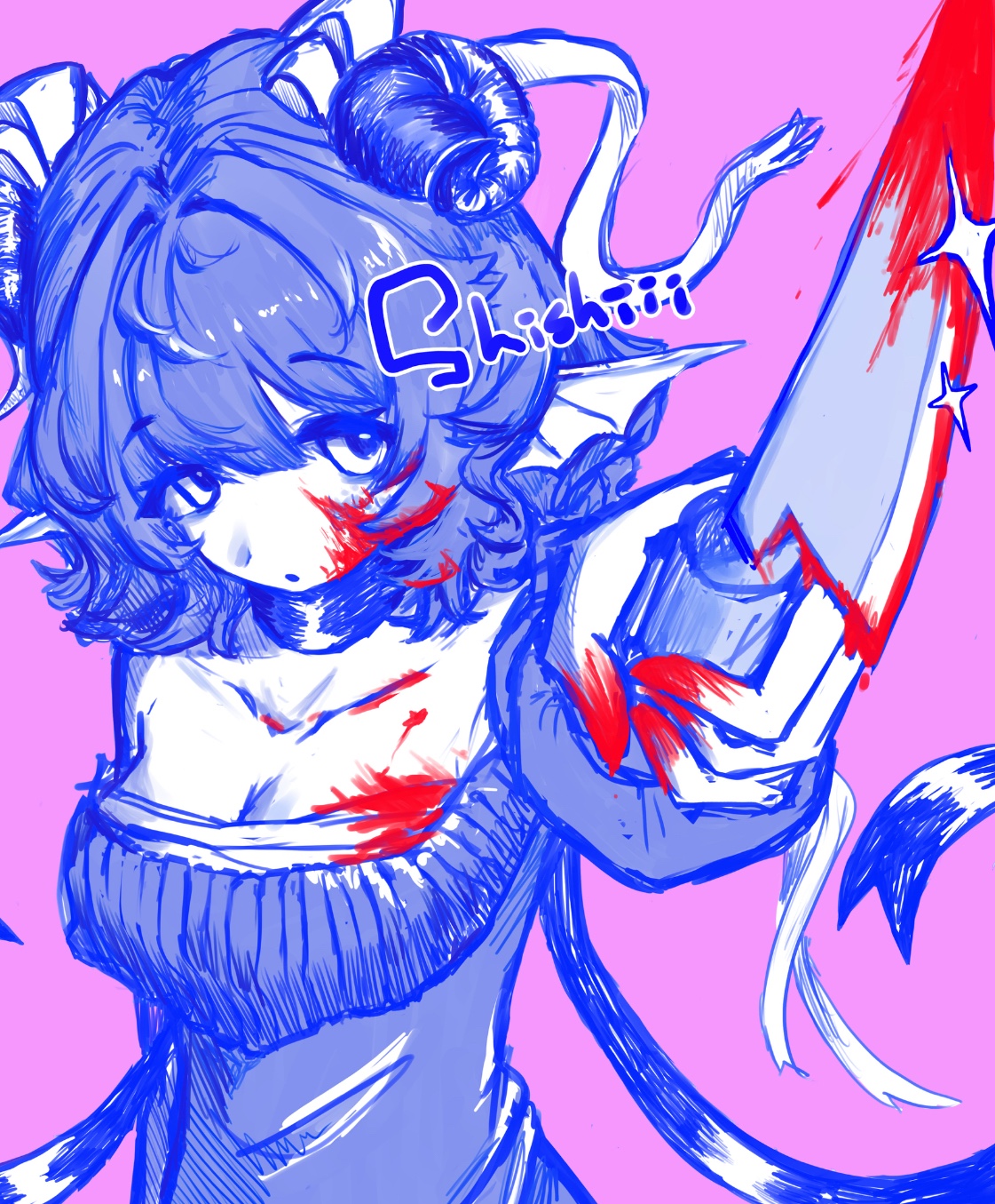 可以加紅色番茄醬,只用克萊因藍線條跟櫻花粉背景這兩個顏色作畫