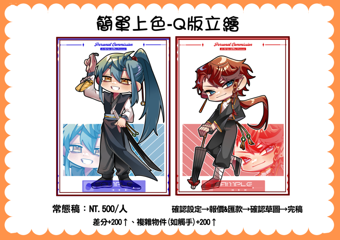 私訊詢問-討論報價-草稿確認-付半額訂金-完稿確認-付餘款-寄件