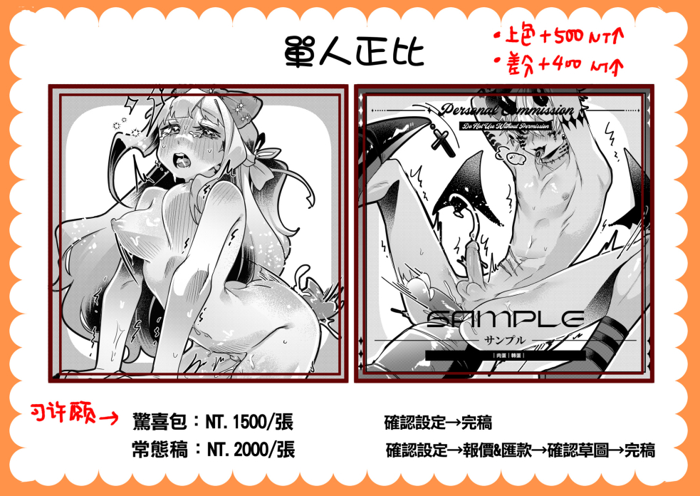 私訊詢問-討論報價-草稿確認-付半額訂金-完稿確認-付餘款-寄件