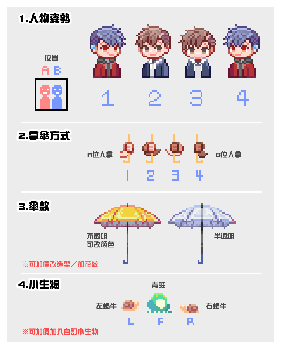 加價:小生物+50$、改雨傘花紋/樣式+50~100$、非人人外當一人算價。