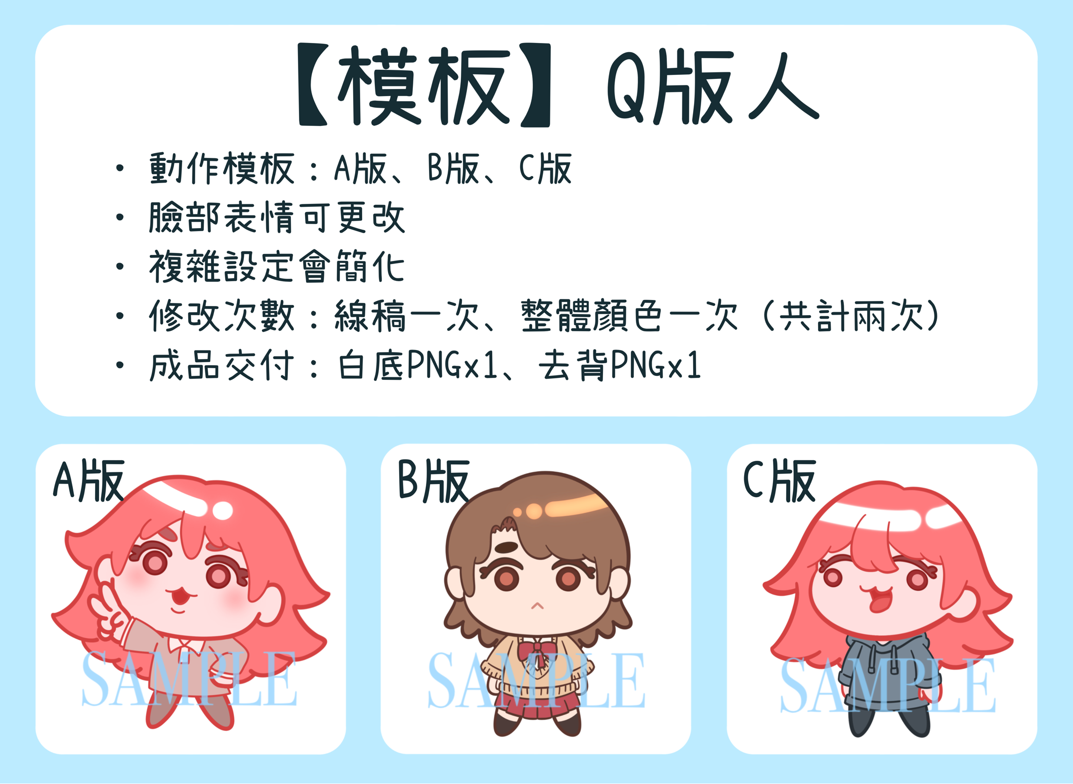 • 草稿階段可修改線稿一次、整體顏色一次(共兩次,不含大幅更改方向)