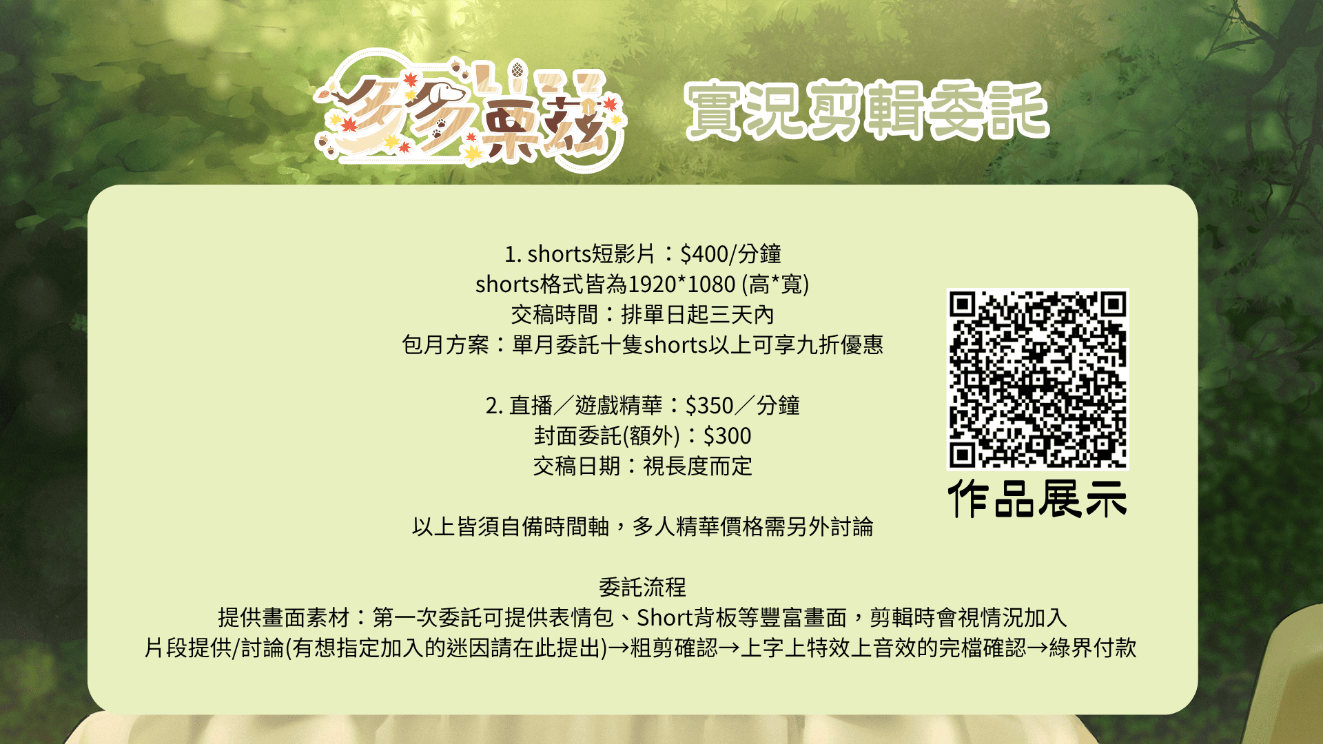 提供畫面素材:第一次委託可提供表情包、Short背板等豐富畫面,剪輯時會視情況加入