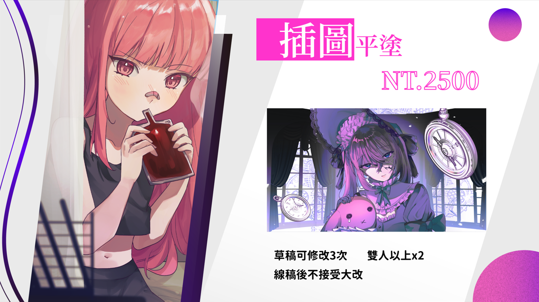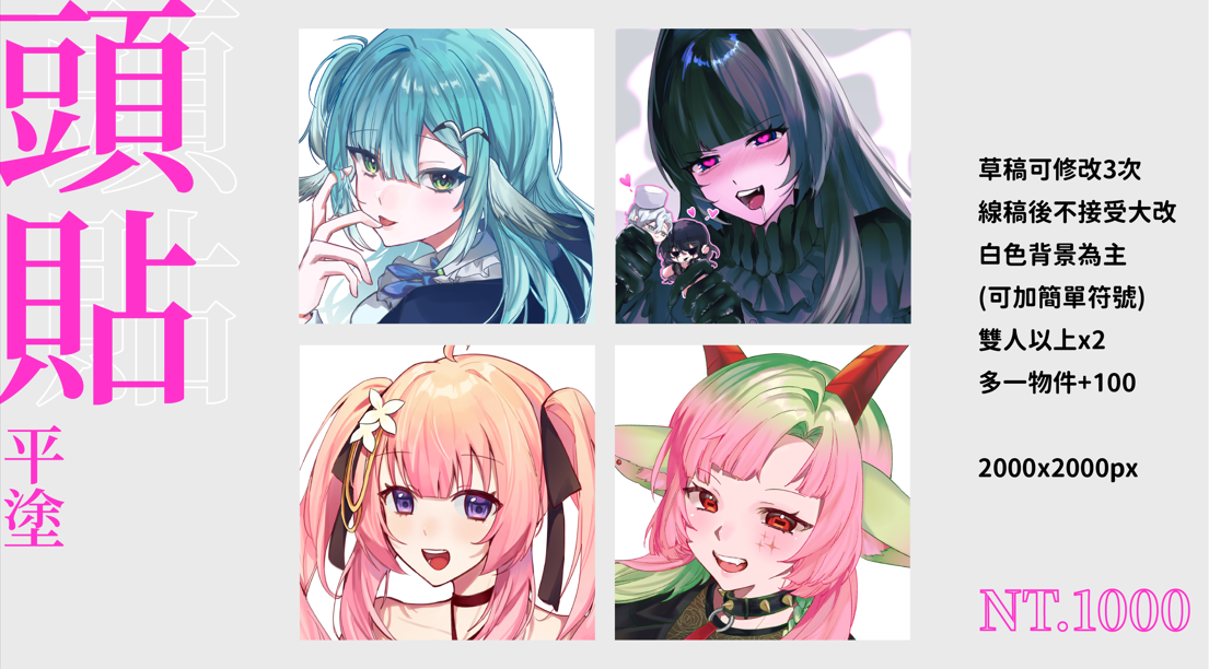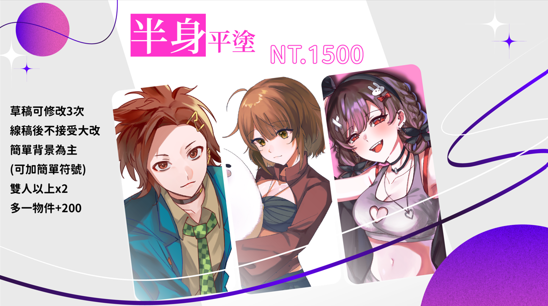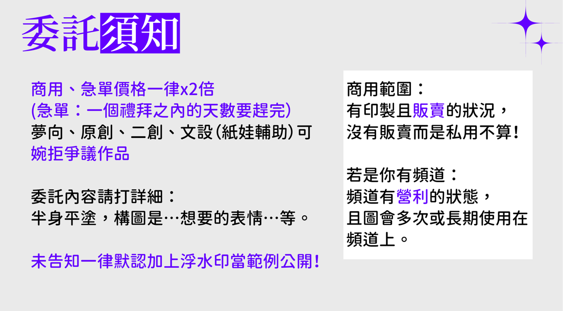 想要委託的項目是半身平塗,構圖、直式橫式、想要的表情、是否有物件,是否有截稿日。